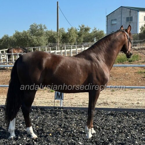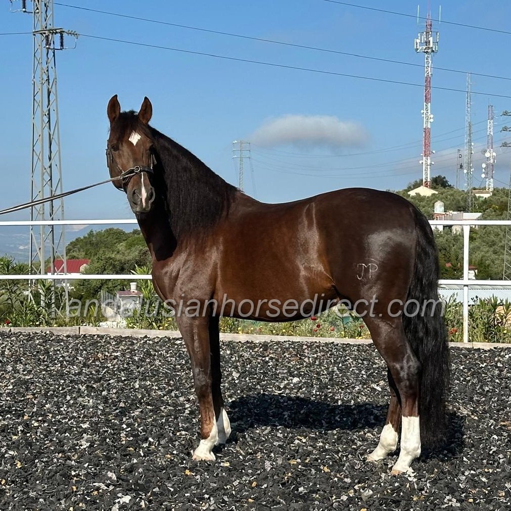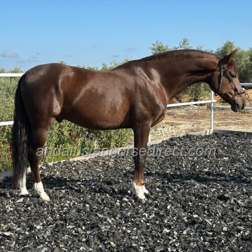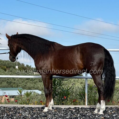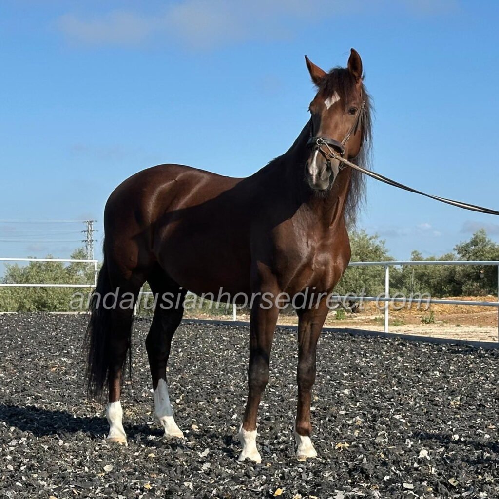 Almonteño *01/01/2018 is a beautiful, elegant horse, an Andalusian without PRE papers, who was mainly out hacking with his previous owner, at ferias and Romerias, during festivals and weekend rides. He has been in training for a few months now with a professional dressage trainer, where he has been gently introduced to the classical riding style with a snaffle bit. A horse with three very good gaits, good natural balance, and willingness to move forward. He has a good back. He has a good attitude to work and has a lot of potential. He is currently being introduced to the basic dressage training, with gymnastic exercises and collection. His transitions are excellent. He accepts the bit well and has a stable and comfortable contact. He already knows half pas at walk, trot, and canter, and is now beginning to play with collection in trot and working into the piaffe. Noble and pleasant horse to handle and comfortable to ride. It should continue to be trained in the same way to establish the training. He loves the paddock and would be ideal for open stable keeping. He is a good horse with a lot of future. His price will be adjusted over time based on his level of training.