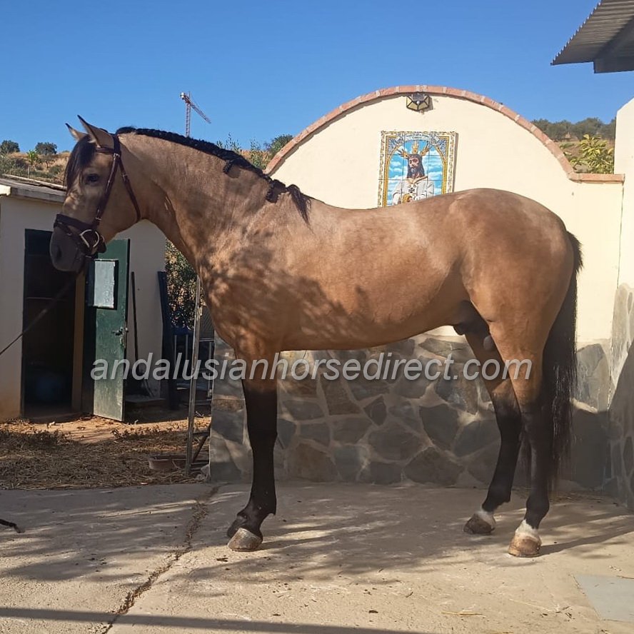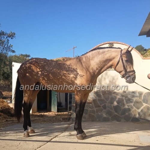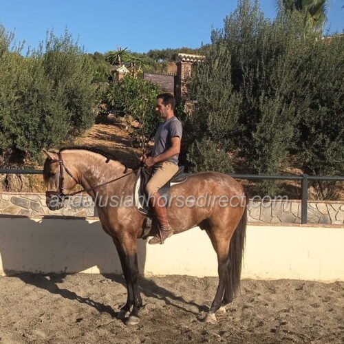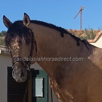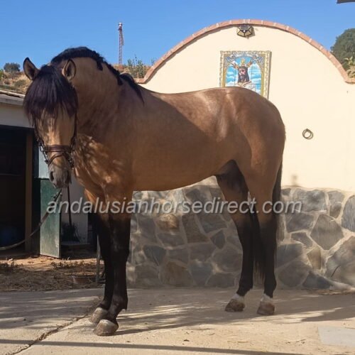 Argos de Rando * 10/03/2022 is a high-quality, expressive PRE buckskin stallion who impresses with his noble appearance and calm, confident nature. Bred and raised by his current owner, he is people-oriented, trusting, and mentally mature. Due to health reasons, he is now being offered for sale with a heavy heart. Argos has been  started gently under saddle in spring 2025 and has proven himself to be exceptionally well-behaved and attentive in all situations — whether in the arena or out on hacks. He now works confidently in basic training, showing good balance, rhythm, and softness, maintaining a steady tempo even on a loose rein. A young horse with outstanding potential, lovely temperament, and elegant presence – the perfect choice for riders looking for a sensitive, reliable, and promising PRE partner. He is already well-established in his basic work, performs lateral movements on two tracks, shows good balance, and is very comfortable to sit. Even on a loose rein, he maintains rhythm and tempo with ease and focus. A young PRE with excellent conformation, a clear and kind mind, and great potential for the future — the ideal horse for riders seeking a sensitive, reliable, and well-started young partner to continue training and grow with.