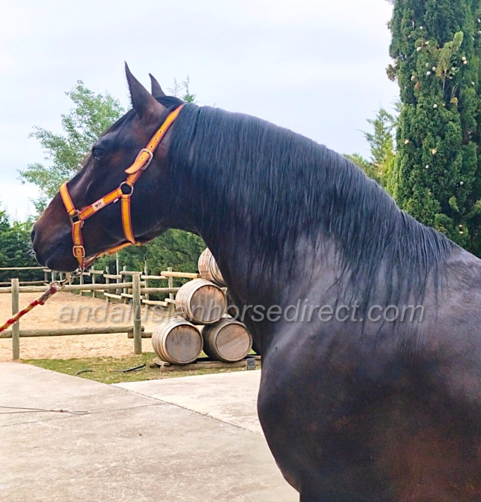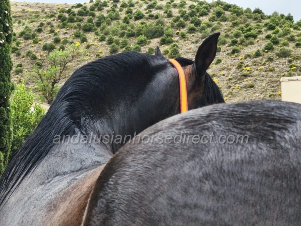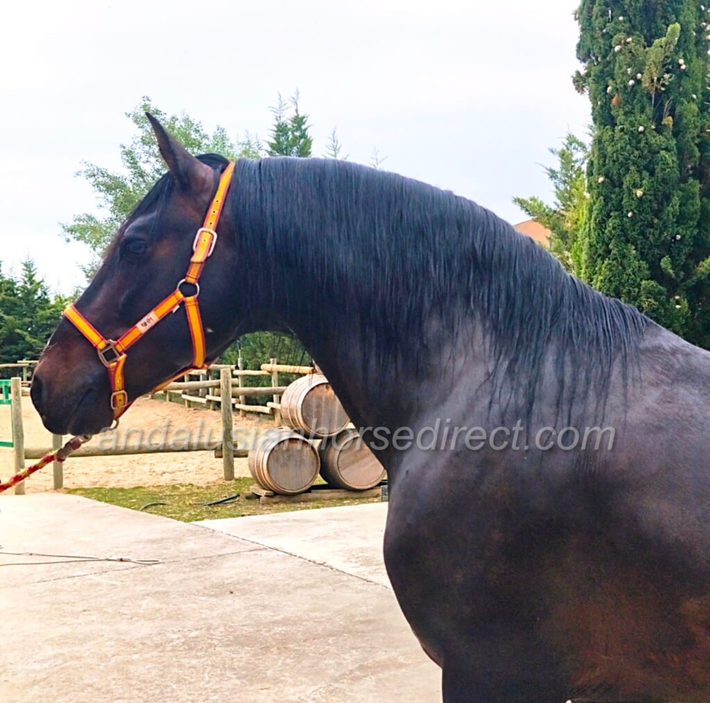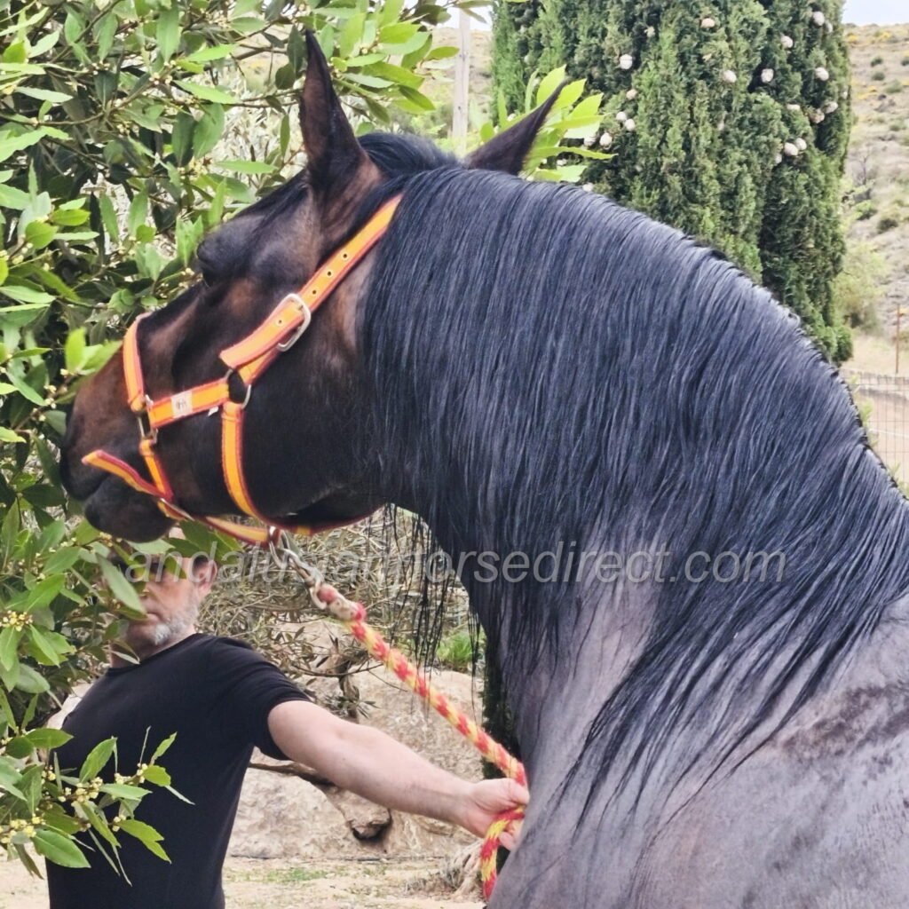 BOLERO CCCXLIV * 21/04/2018 is a stunning, baroque PRE stallion in a rich chocolate brown color, coming from almost pure Yeguada Militar bloodlines, a pedigree that speaks for quality, type, and expression. This charming stallion stands out especially for his exceptionally kind and people-oriented character. He is extremely well-behaved, gentle, and easy to handle in everyday situations. Even children and teenagers can safely groom, wash, and lead him. He is occasionally ridden by a child, including in the countryside, making him a reliable partner for the whole family.