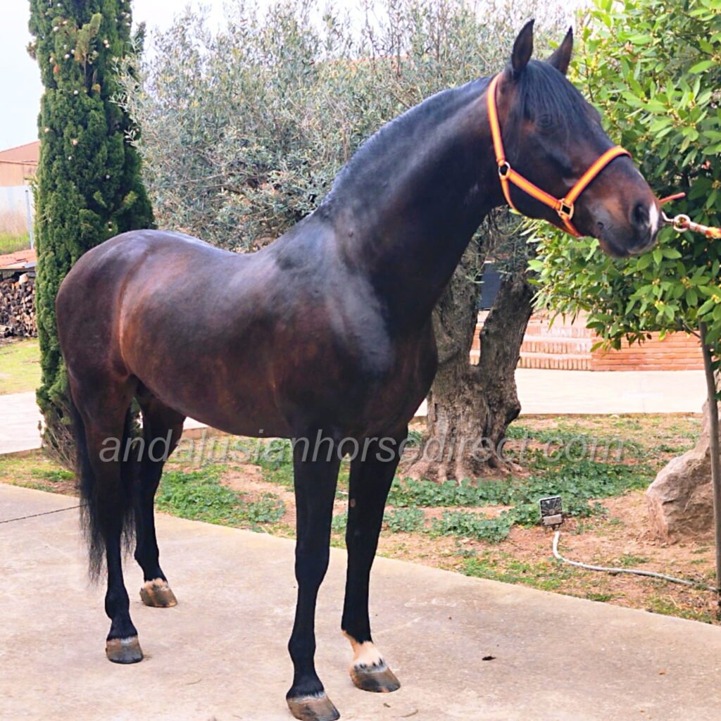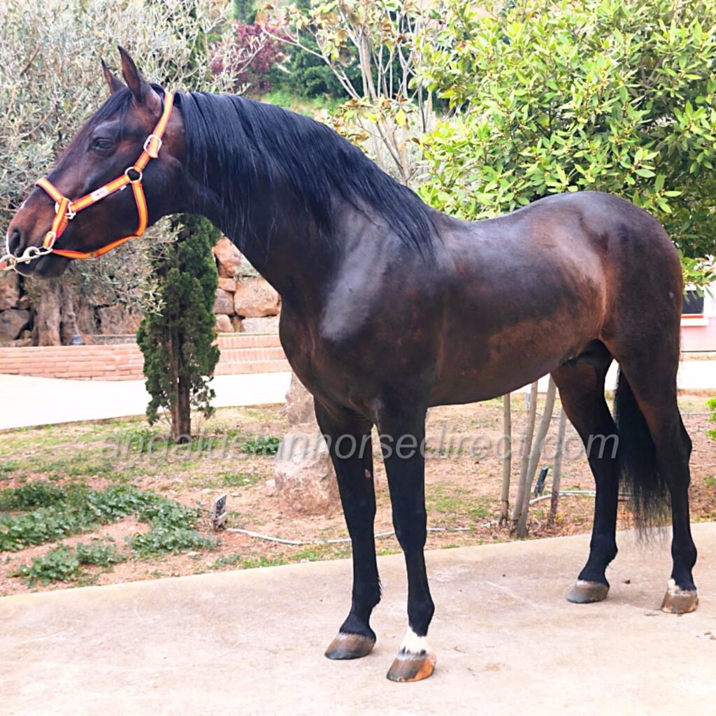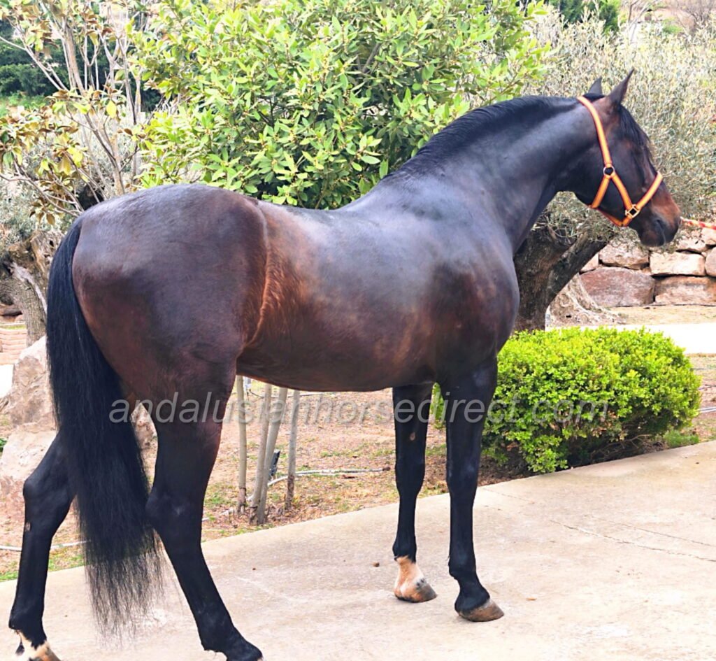 BOLERO CCCXLIV * 21/04/2018 is a stunning, baroque PRE stallion in a rich chocolate brown color, coming from almost pure Yeguada Militar bloodlines, a pedigree that speaks for quality, type, and expression. This charming stallion stands out especially for his exceptionally kind and people-oriented character. He is extremely well-behaved, gentle, and easy to handle in everyday situations. Even children and teenagers can safely groom, wash, and lead him. He is occasionally ridden by a child, including in the countryside, making him a reliable partner for the whole family.