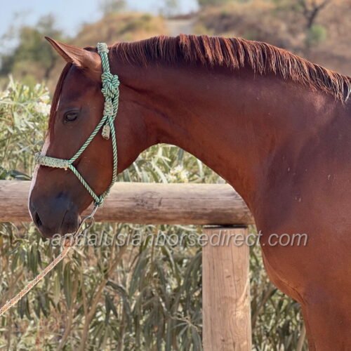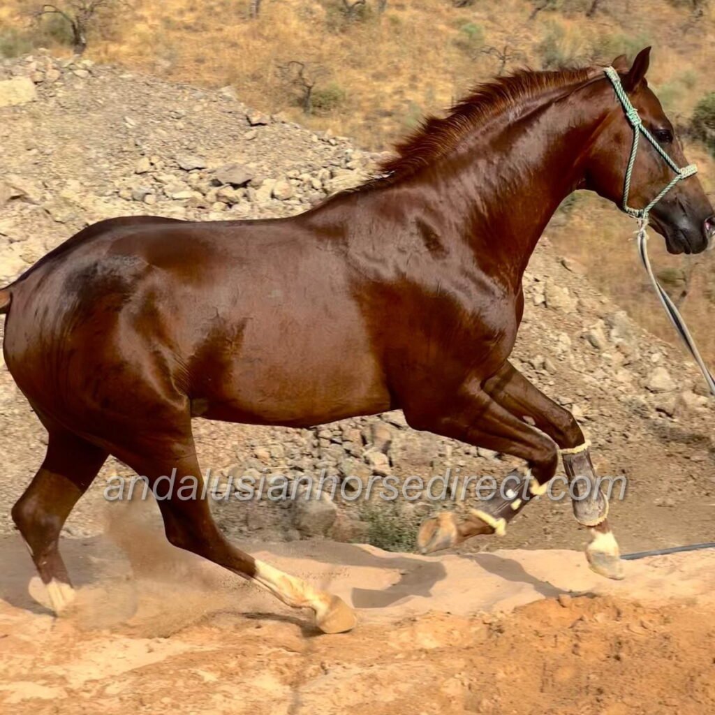 Charrua * 12/04/2021 is a charming, purebred Anglo-Arab stallion raised with care in a natural, horse-friendly environment. He is registered in the stud book Libro Genealógico Anglo-árabe. He has a solid schooling in a snaffle and displays excellent reliability, manners, and rideability. His friendly, people-oriented temperament makes him an absolute pleasure both to handle and to ride. According to his age, he performs the basics in the arena: leg-yield, work on two tracks, shoulder-in, and clean transitions. He is also experienced and relaxed out on hacks and would be a brilliant family horse. Charrua shows remarkable potential for dressage and we can also see him in working equitation. He works with motivation and enthusiasm, and he already enjoys small jumps. To develop his talent further, he will soon be receiving additional professional training in show jumping. With his willingness to work and versatility, he is also very well suited for Working Equitation. Thanks to his impeccable pedigree, he is additionally interesting for breeding, especially for Vaquero disciplines or as part of a “3 Sangres” line. A talented young stallion with heart, character, and a very promising future.
