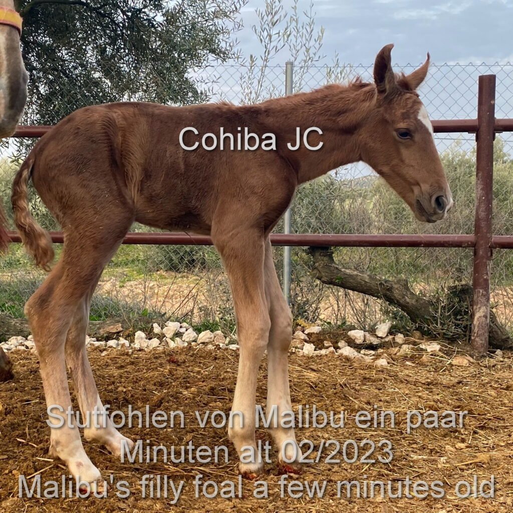 However, Cohiba stands out not only for her looks but also for her breeding and upbringing. She comes from a caring private breeding program and has been raised in a natural and horse-friendly environment. You can see a picture just after birth in the picture gallery. Her dam, Malibu del Chacha, is an Anglo-Arab mare owned by the breeders, known for her quality, rideability, and excellent character. The owners themselves are experienced dressage riders and trainers. Malibu herself has been achieved by her owners, who are dressage riders and trainers, when she was 1 year old, directly from the breeder, where she grew up in the wide natural fields. We have also published a picture of Malibu as foal, as well as one of her sire and one of her Palomino mother (Cohiba’s grandparents). Malibu is currently living in a field nearby the stables.