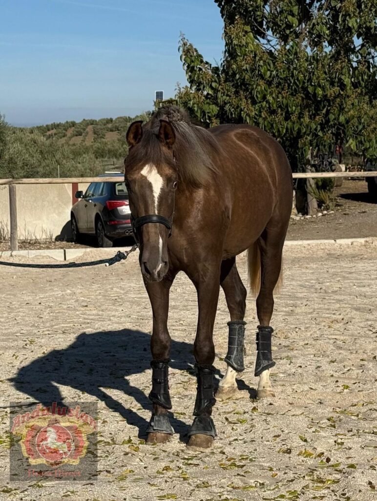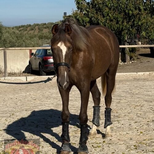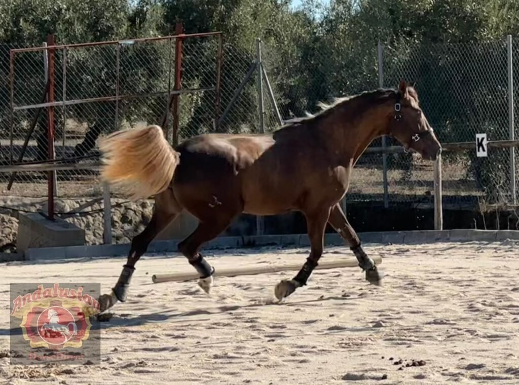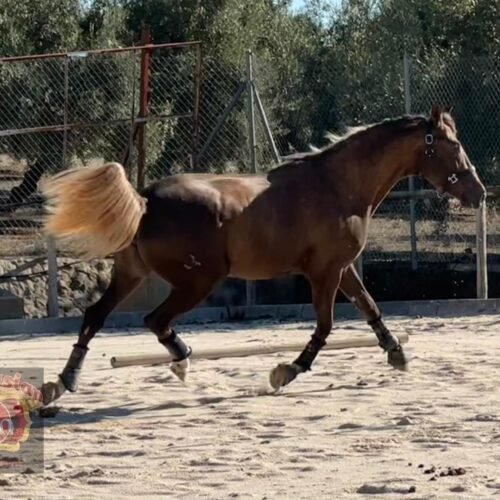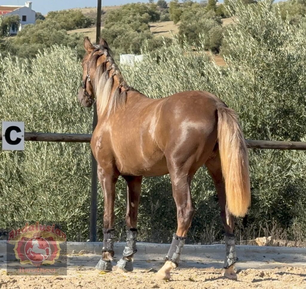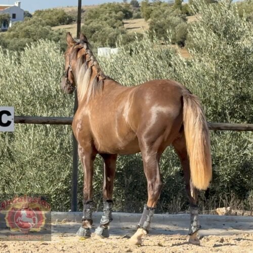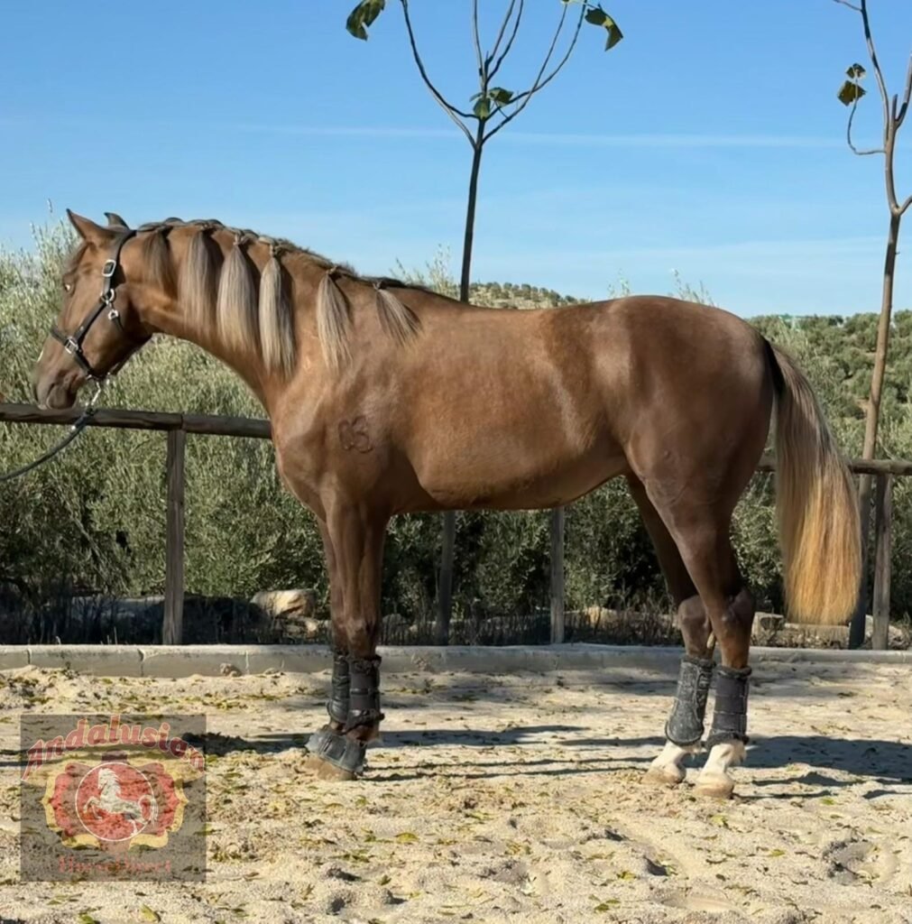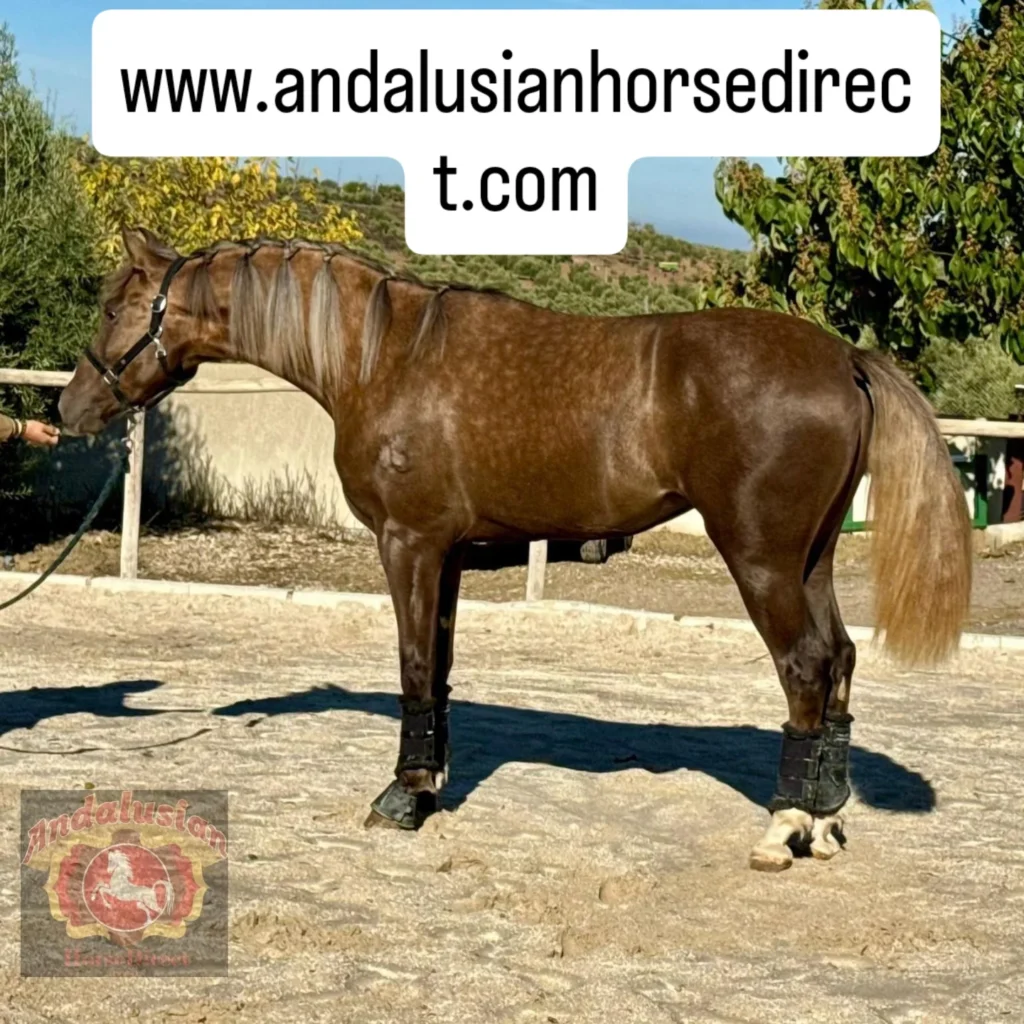 *COHIBA* 01/01/2023 is a beautiful chocolate palomino rare to find, she has a CDE Spanish sports horse, she has currently been started under saddle and is being lunged in a sadlle and a bridle taking it ver slowly according to her age, Cohiba is a very sweet natured mare and she moves very well.