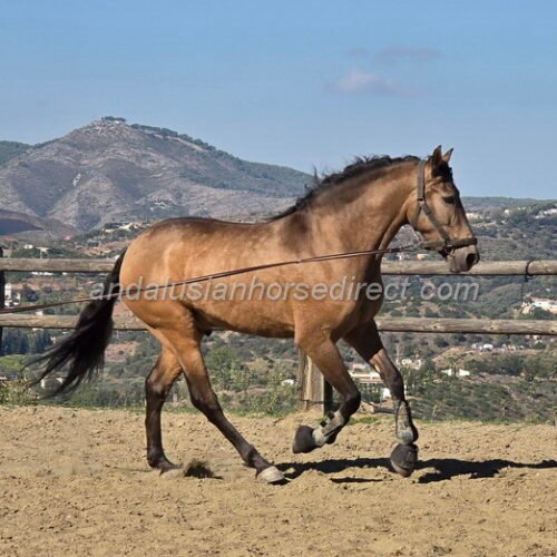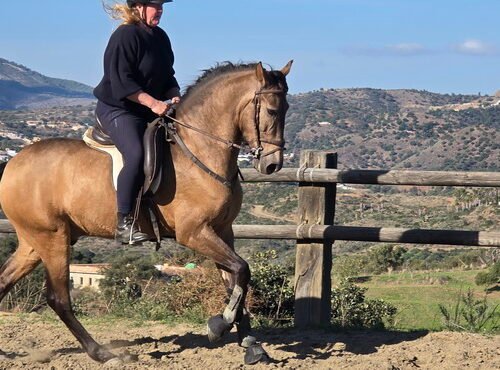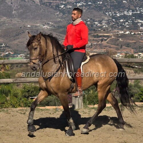 Elegante CCXXVI * 15/05/2020 is a highly talented buckskin PRE gelding, versatile and safe! He has been driven and ridden to a very pleasant level, wonderful conformation, well trained including some high school like piaffe, passage, Spanish Walk & levade, all as well from the ground as ridden! Also hacking is a pleasure with this extraordinary horse, he is save along roads and may be ridden alone or in company. He enjoys training, which means he learns quickly. Both from the ground and under saddle. He is a very special horse, hard to find, he is also ideal as a leisure horse, for trail rides, along the road, for carriage rides with the family or even for competitions. A horse for all occasions, that ticks all the boxes! Elegante has been to ferias and local festivals, and he also has a set of x-rays available!