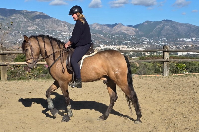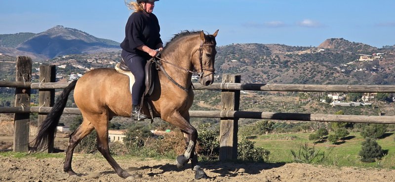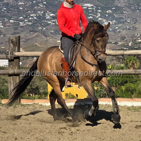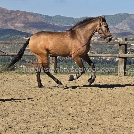 Elegante CCXXVI * 15/05/2020 is a highly talented buckskin PRE gelding, versatile and safe! He has been driven and ridden to a very pleasant level, wonderful conformation, well trained including some high school like piaffe, passage, Spanish Walk & levade, all as well from the ground as ridden! Also hacking is a pleasure with this extraordinary horse, he is save along roads and may be ridden alone or in company. He enjoys training, which means he learns quickly. Both from the ground and under saddle. He is a very special horse, hard to find, he is also ideal as a leisure horse, for trail rides, along the road, for carriage rides with the family or even for competitions. A horse for all occasions, that ticks all the boxes! Elegante has been to ferias and local festivals, and he also has a set of x-rays available!