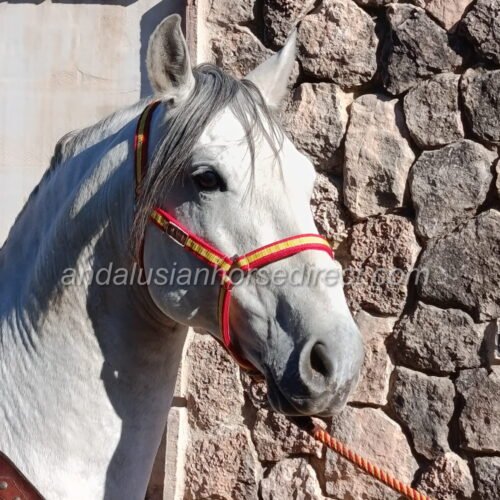 FRAGUERO V * 15/05/2018, is a baroque, expressive PRE stallion of the old type – a true rarity. He has been trained with great care, knowledge, and sensitivity, always ridden in a snaffle. Fraguero is exceptionally reliable, easy to handle and stands out for his remarkable personality. He is versatile, intelligent and very people-oriented. Acquired as a young stallion by his current owners, he has been trained by professionals who work with horses for shows and performances, as well as for private leisure riding. Their philosophy focuses on building a deep bond between horse and rider, allowing work to remain light, playful and harmonious. Fraguero’s training began gently from the ground, always with joy and without pressure. As a result, he has retained his natural openness, motivation and calmness. His temperament is relaxed and balanced – he never over reacts or becomes nervous and transmits a safe and confident riding experience.