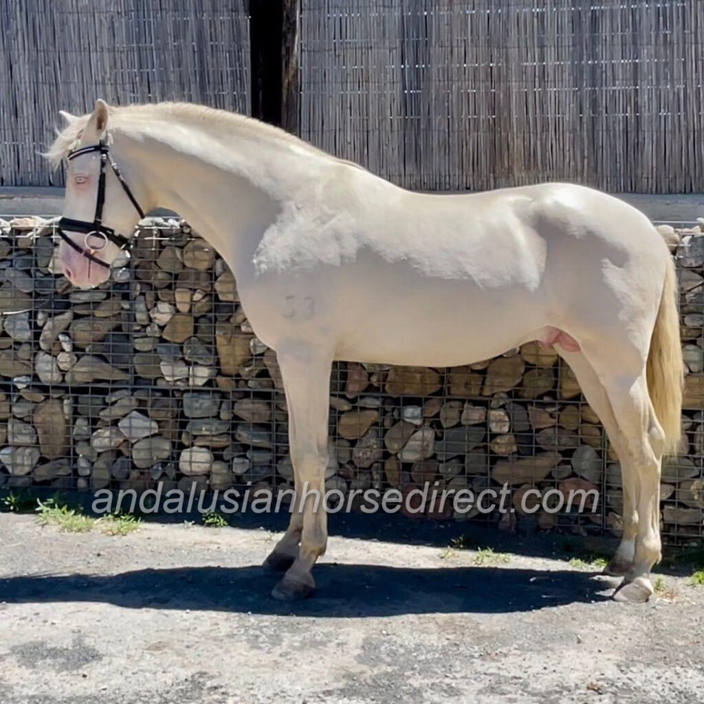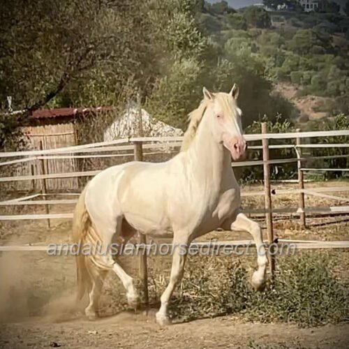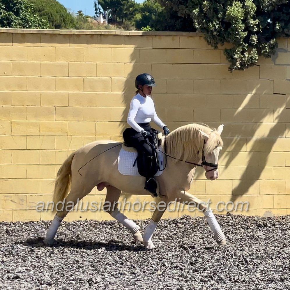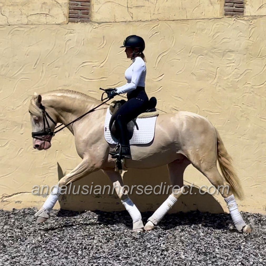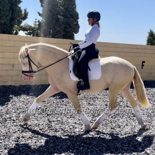 Guero II * 15/03/2021 is a splendid, beautiful Cremello PRE stallion, colour tested as Perlina with blue eyes, with stunning movements, very sweet character, easy going and well established in the basic gaits. He has been selected by his lady owner who is a professional rider and training horses to a high level. She likes to see her Youngsters in loving hands, and has therefore prepared him in a smooth easy way to be able to continue this basic work now your way. She says she has never had such a lovely sweet character horse. Apart he has a lot of potential for sport and dressage. His pedigree is based in important lines such as Yeguada Militar (Deco, Jecomias), Paco Marti (Carmnelo II, Caramelo XXXVI), Escalera, El Varon (Malibu IV) and some pure Carthusian origins. Guero has a set of clean x-rays!