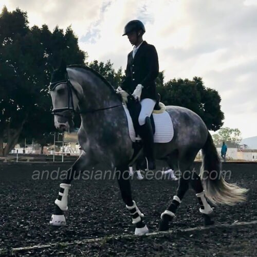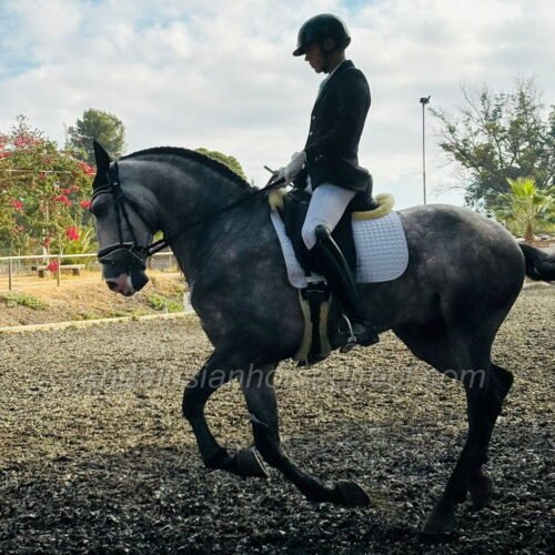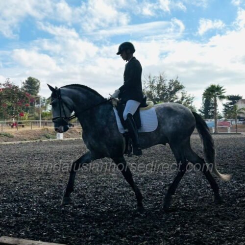 JUDIO TB * 18/04/2021 is a well built harmonic PRE Gelding, dark dapple grey, wonderful gaits. Very trainable mind, a wonderful horse for dressage he has now competed twice and got a 2nd and a first! All on a snaffle, he also hacks out and is a smart horse to be brought forward. His blood lines are based in Romero Benitez, Granda Losada and Marin Garcia.