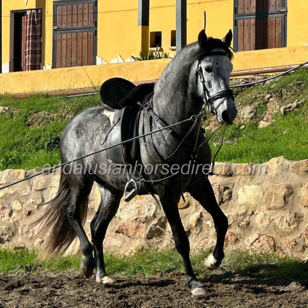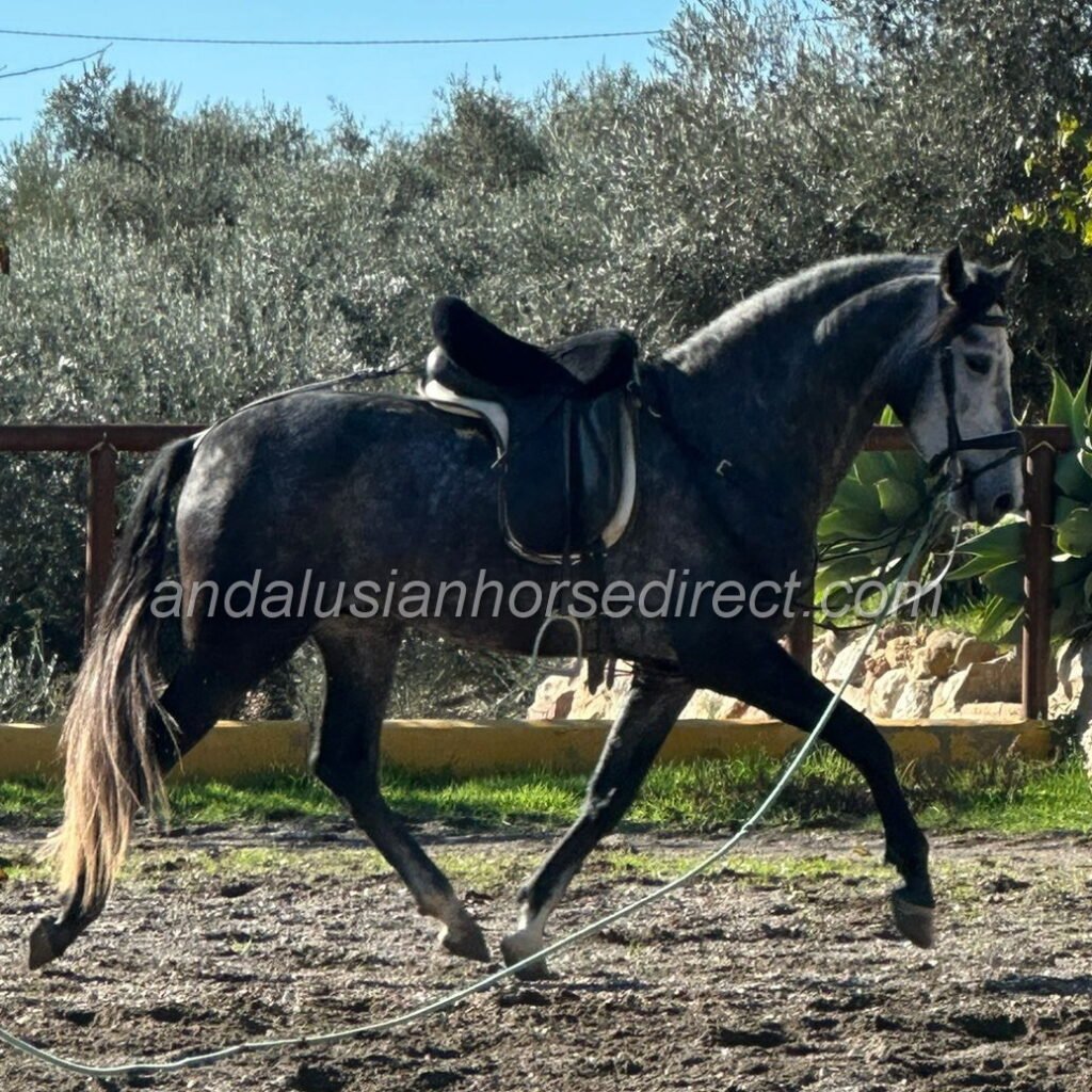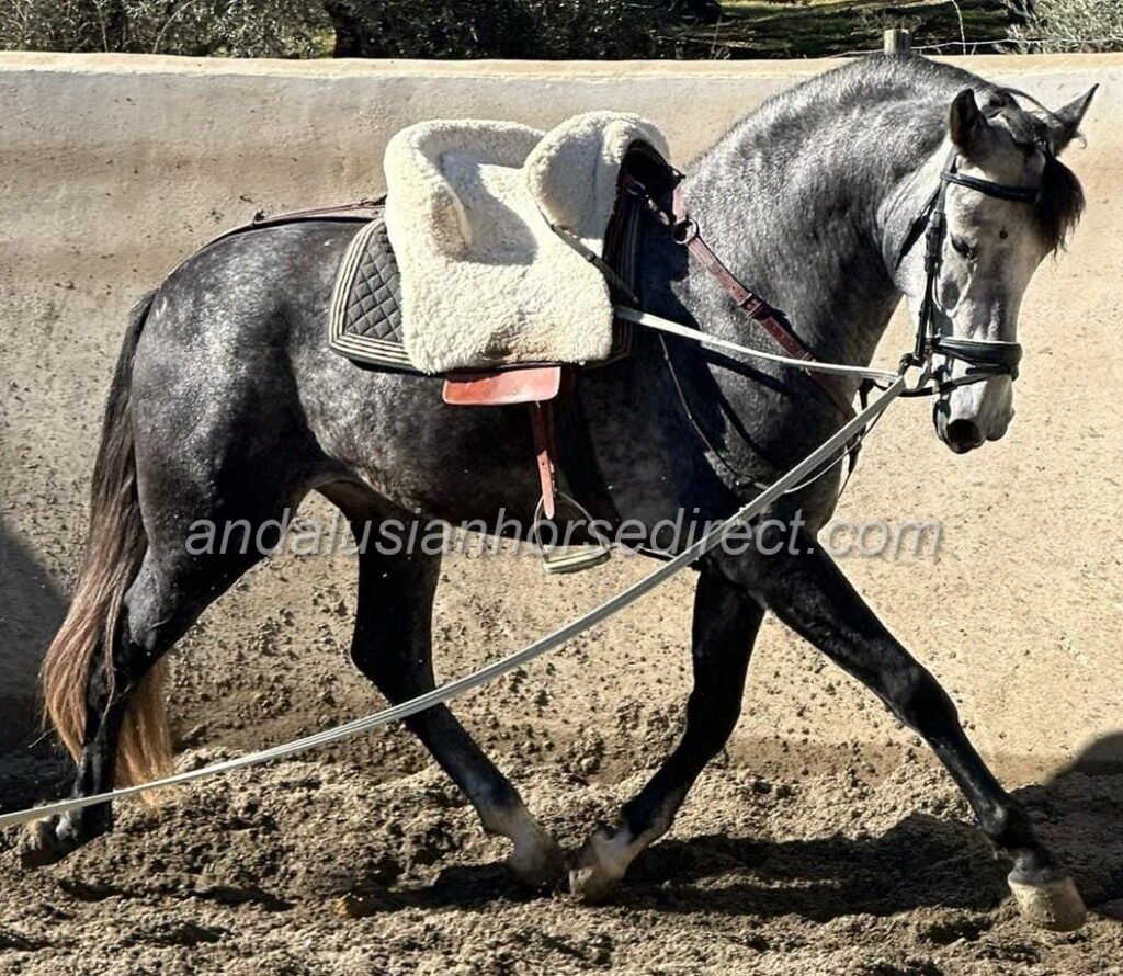 Letrado * 5/5/2022 is a talented and handsome Andalusian gelding with a sport horse passport. He impresses with expressive, high-quality movement, a powerful hindquarters and excellent ground cover. He is currently in professional training and being developed appropriately for his age. Letrado is familiar with basic arena work as well as relaxed hacking out. He is quick to learn, attentive and naturally talented, picking up new exercises with ease. From the ground, he already performs the Spanish Walk confidently. In addition to his athletic ability, Letrado stands out for his excellent character. He is kind, cooperative and a real pleasure to handle and ride. A promising young Andalusian gelding with sport potential, charisma and a bright future ahead – suitable for both leisure and ambitious riders.