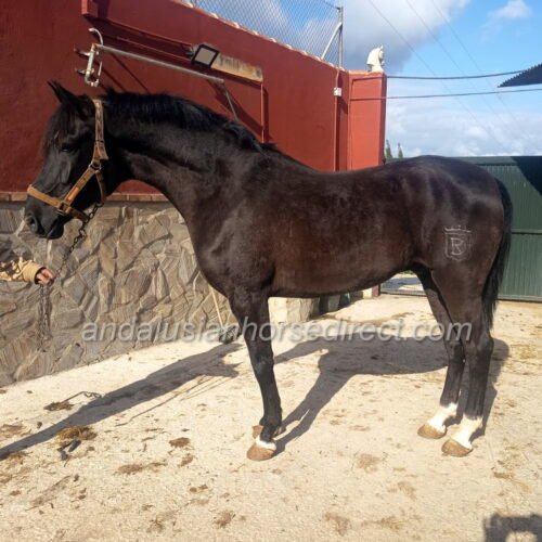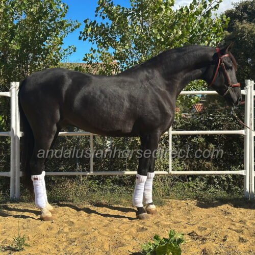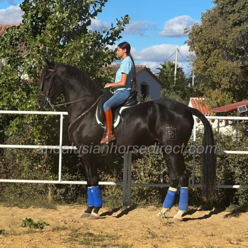 Lorongo, born on 30/05/2020, is a remarkably tall, jet-black Andalusian gelding with a big heart and a wonderful, easy-going character. He is straightforward to handle, pleasant to ride, and perfectly suited for both leisure riders and those with sporting ambitions.