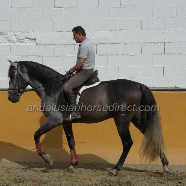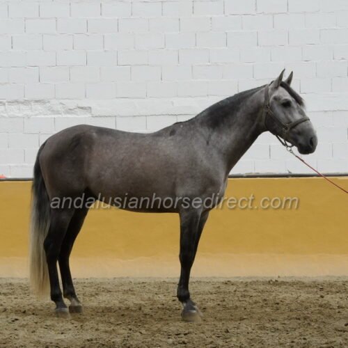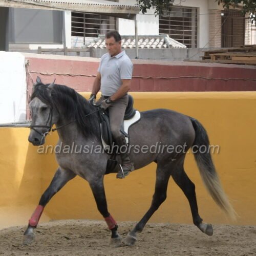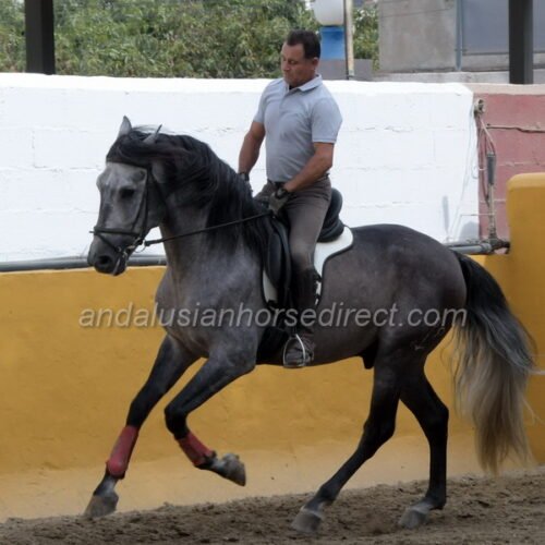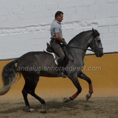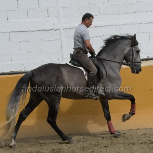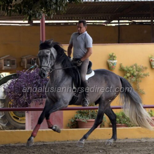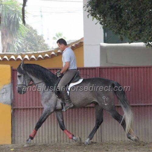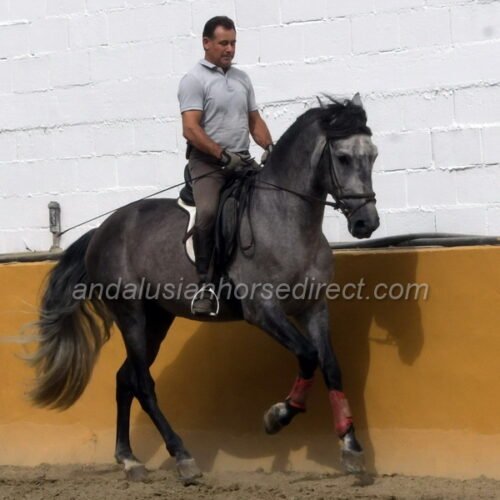SAFRISCO ANCLA II *25/04/2021 is a nice PRE stallion from private hands. The owner bought him directly from the breeder and has him stabled at a mixed training yard where he has been started and is being brought forward without time pressure in a nice professional way. The rider and trainer is a also a show rider and works with training in haute école up to the levade, he is being slowly introduced to exercises on a snaffle bit. They allow plenty of time before starting collection work. The horse may find his balance, engages his hindquarters actively, and is currently practicing counter canter work and lateral work, half pass etc. He is now starting canter from the walk, and as can be seen, he is completely calm and relaxed, even with many other horses in the school at the end of the video. He also hacks out at weekends, as the stable is located directly by the river with access to natural trails. A rare opportunity to acquire a horse from well-cared-for breeding and loving hands. The reason for the sale is lack of time, as the daughter also rides only rarely. His father, Pavito MJB, is a half-brother to a beautiful, tall Bohorquez stallion that we had sold several years ago . Safrisco’s father, Tutor Arenas II (Video 2013 here https://youtu.be/3S1eGfVw_0g?si=um7z_z7XJ4xem37x), is the son of the legendary elite stallion Duque CXIII (* 2005, 1.68 m) https://horseonline.es/en/coverings/743/duque-cxiii/f/3/ from the Yeguada Las Arenas breeding. https://www.instagram.com/p/C0MgZ7dM-st/. His stallion approvals and awards are overwhelming! Calificado, Mejorante, Elite and recommended by the ANCCE as a dressage sire! Also, his father Educado X (Guardiola) https://www.ecujama.es/caballos-sementales-pre-educado.html was Mejorante, Calificado and Elite approved!