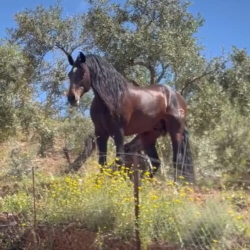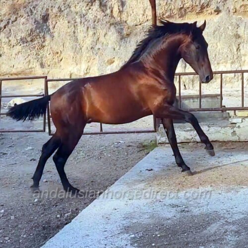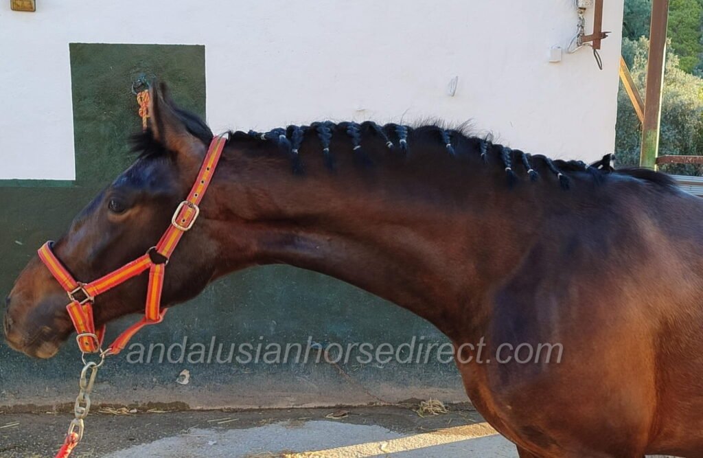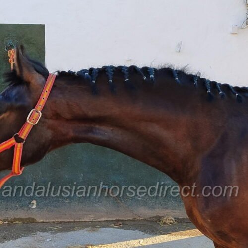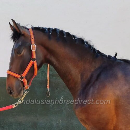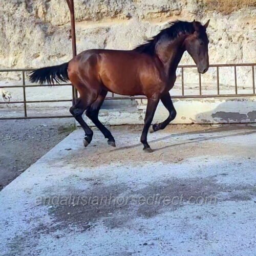 Valioso XV * 25/11/2023 is a stunning bay PRE colt with amazing pedigree! He is very well handled, has no problem to be touched everywhere, tied or lead around with a rope, lifting up his hoof, showers, and is learning lunging now, he now is a great opportunity to take him over and mould into what you want, he is very willing and learns quickly. He is being kept outside in freedom near to a mare with foal, no problem with other horses, at night he comes into a stable to be fed and sleep. So, he is used to open stables as well as fields and living with other horses.