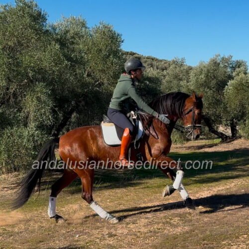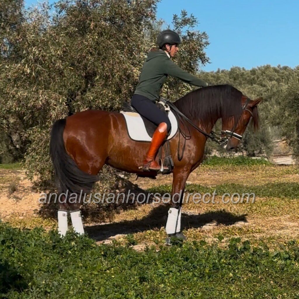 She is well accustomed to hacking and trail riding, and she is also ridden by a young girl who has already presented her successfully at a small competition. Her owner regularly takes her to Ferias and on relaxed rides through the village, making her an experienced, confident and reliable partner in various environments.