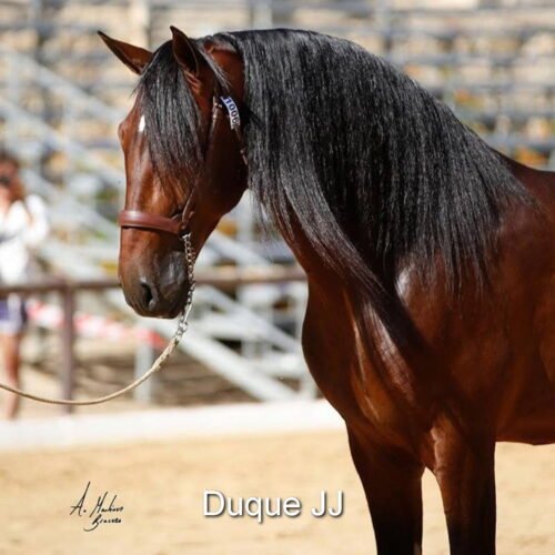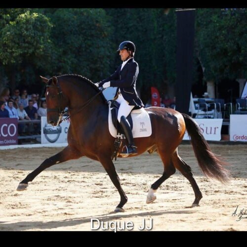 Her sire Duque JJ (see photos), from the stud Juan José Montes Sánchez, is an exceptional PRE stallion with numerous national and international titles and medals (see link with pictures and videos of the competitions here: https://www.concursosancce.com/public3/participant?code=724015110278879). He is the son of the famous Yaco de Torreluna https://yeguadatorreluna.com/index.php?view=article&id=205&catid=2&lang=es ( see link here: https://yeguadatorreluna.com/index.php?view=article&id=205&catid=2&lang=es) , a calificado and mejorante awarded stallion, additionally approved by ANCCE as a dressage sire (green ribbon). Video “Yaco de Torreluna”, Campeón Absoluto de Funcionalidad de Equigal 2014 here: https://yeguadatorreluna.com/index.php?view=article&id=205&catid=2&lang=es . Yaco de Torreluna himself descends from Yaco II of the prestigious Marín García dressage line, former World Champion.